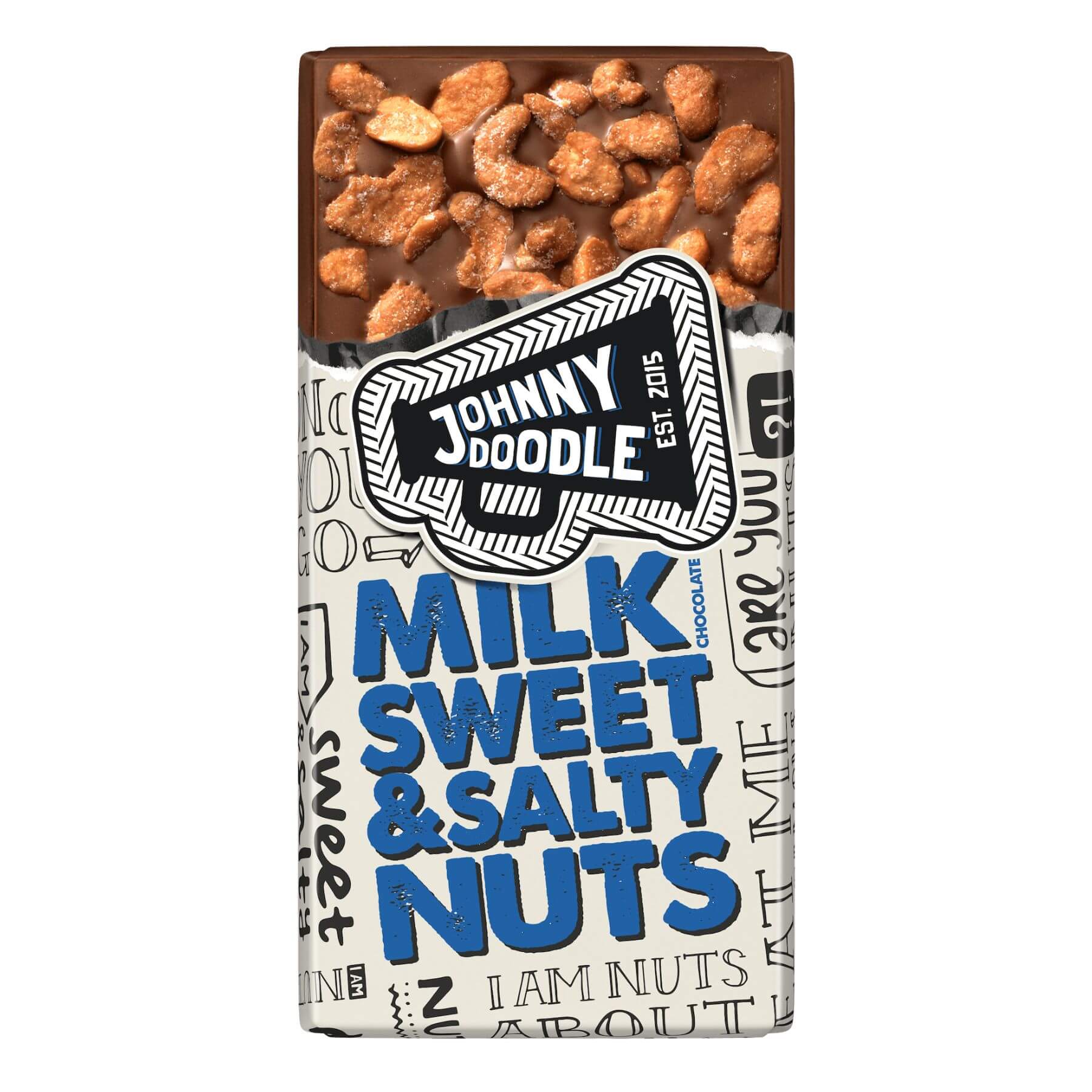Johnny Doodle Milk Sweet & Salty Nuts ist dein neuer Lieblings-Nussmix in Schokoladenform. Mandeln, Erdnüsse und Cashews sorgen für einen crunchy Mix, der sich mit der cremigen Fairtrade-Milchschokolade zu einem Sweet-&-Salty-Match made in heaven verbindet. Jeder Bissen: bold, lecker, unforgettable. 😍🍫