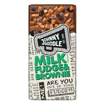 Johnny Doodle Milk Fudge & Brownie ist ein echter Showstopper: erstklassige Kuvertüre-Milchschokolade, großzügig getoppt mit weichen Brownie-Stückchen und Johnnys eigenen Vanille-Fudge-Würfeln. Der Geschmack? Soft, rich und einfach wow. 😍🍫
