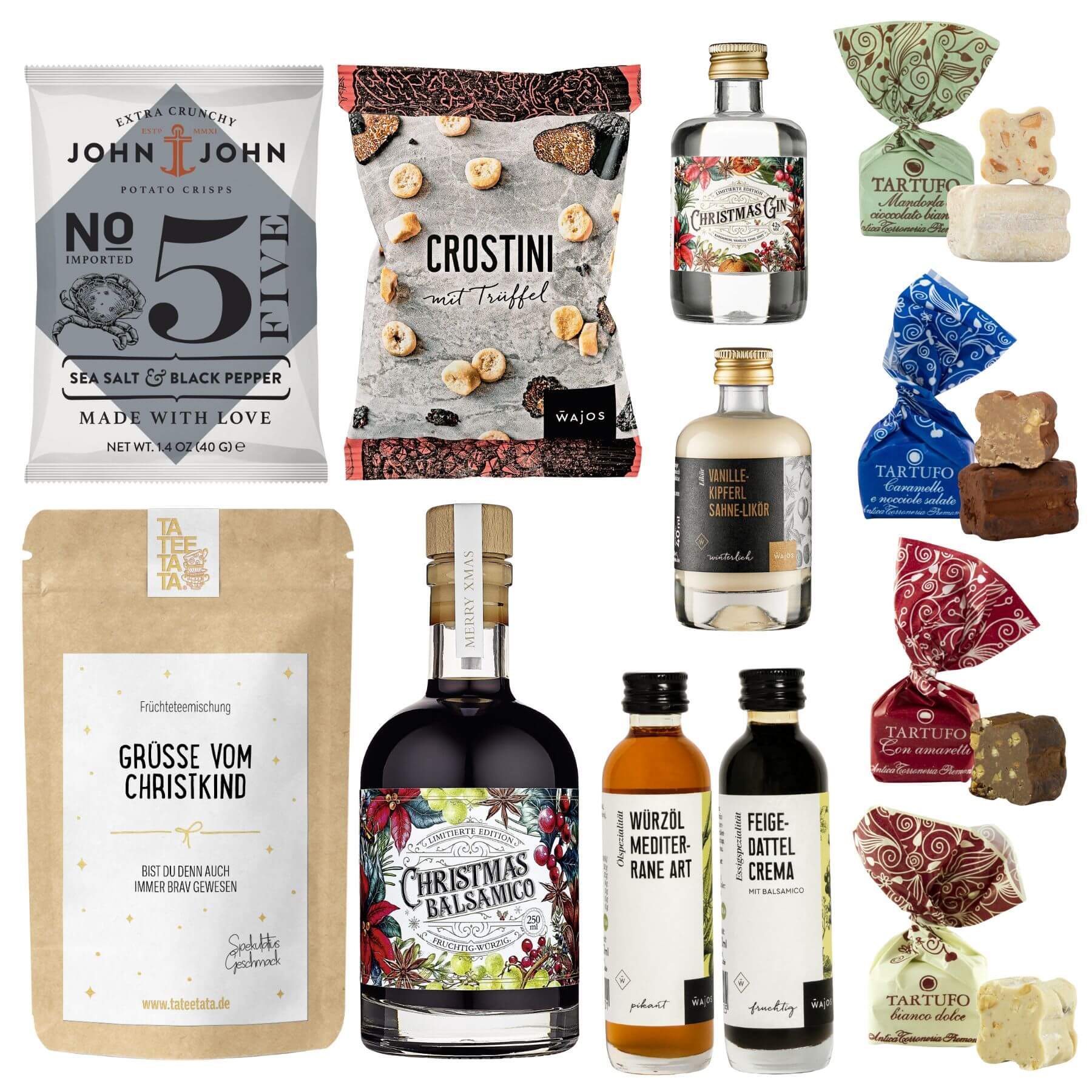 Von edlem Christmas Balsamico und fruchtig-winterlichem Tee bis zu cremigen Likören und feinen Tartufi – jedes Produkt wurde mit Liebe und Geschmack ausgewählt. Dazu kommen mediterrane Öle, aromatische Cremas, knusprige Snacks und festliche Schokolade. Dieses Set ist die perfekte Mischung aus Genuss, Stil und Weihnachtsstimmung – ready to spread some joy. 🍷🍫🌟